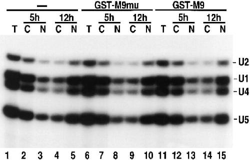 Figure 5. Saturation of M9mediated import does not interfere with nuclear uptake of U snRNAs. 32pCp-labeled U1, U2, U4, and U5 snRNAs were injected into the cytoplasm of oocytes either without competitor (lanes 1–5) or together with 10 mg/ml of recombinant GST-M9mu (lanes 6–10) or GST-M9 (lanes 11–15). Oocytes were dissected 3 or 12 h after injection as indicated, and RNA was analyzed on denaturing polyacrylamide gels. Lanes 1, 6, and 11 were loaded with RNA extracted from total oocytes immediately after injection.