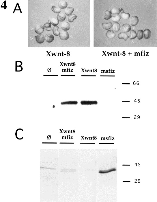 Fig. 4. (A) mfiz antagonizes the axis-inducing capacity of Xwnt-8. Embryos were injected with 10 pg of Xwnt-8 mRNA (left side) or 10 pg Xwnt-8 mRNA and 100 pg mfiz mRNA (right side) into the marginal zone of the two ventral blastomeres of a four-cell stage embryo. Representative views are shown, duplicated axes are indicated by arrow heads. (B,C) Expression of Xwnt-8 and mfiz in microinjected embryos. Embryos were injected at the four-cell stage embryo Xwnt-8 mRNA, mfiz mRNA, or both as indicated. To detect Xwnt-8 and mfiz in Western blotting, particularly high doses of 2 ng of each mRNA were injected. At the blastula stage when axis determination takes place, embryos were homogenized and lysates were probed for expression of Xwnt-8 by the myc-tag monoclonal antibody 9E10 (B) or for expression of mfiz with rabbit polyclonal mfiz antiserum SA1804 (C).