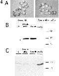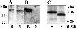 Fig. 3. (A) Purified fiz protein in Coomassie-stained SDS-PAGE. R denotes recombinant protein produced in CEF cells. Native protein as purified from BHK cells is marked N. (B) Western blot of samples in (A). The blot was probed with the rabbit polyclonal antiserum SA1804 specific for the mouse fiz (R) protein. The hamster fiz protein (N) did not react. (C) Silver-stained SDS-PAGE of purified BHKfiz protein. Samples were treated with (+) and without (−) β-mercapto-ethanol.
