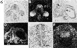 Fig. 6. Localization of mouse fiz mRNA in 9.5 dpc embryos. (A) Bright field illumination of a frontal section through the rostral region of a 9.5 dpc mouse embryo hybridized with 35S-labelled mfiz antisense RNA probe. (B) Dark field image of (A). (C) Bright field illumination of a frontal section showing both the caudal and the head region of the embryo. (D) Dark field image of (C). (E) Enlargement of the neural tube area in (A). Highest expression of mfiz mRNA is marked by a white arrowhead. (F) Dark field image of (E). Abbreviations: FL, forelimb bud; FP, floor plate; HL, hindlimb bud; HM, head mesenchyme; MD, mesonephric duct; NE, neuroepithelium; NT, neural tube; RM, Reichert's membrane; So, somite. Bars represent 160 μm in (A–D) and 40 μm in (E,F).