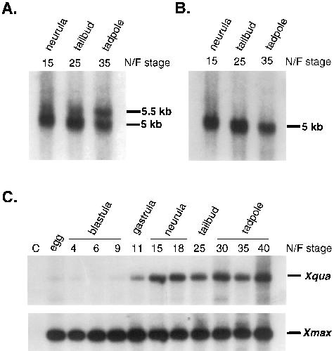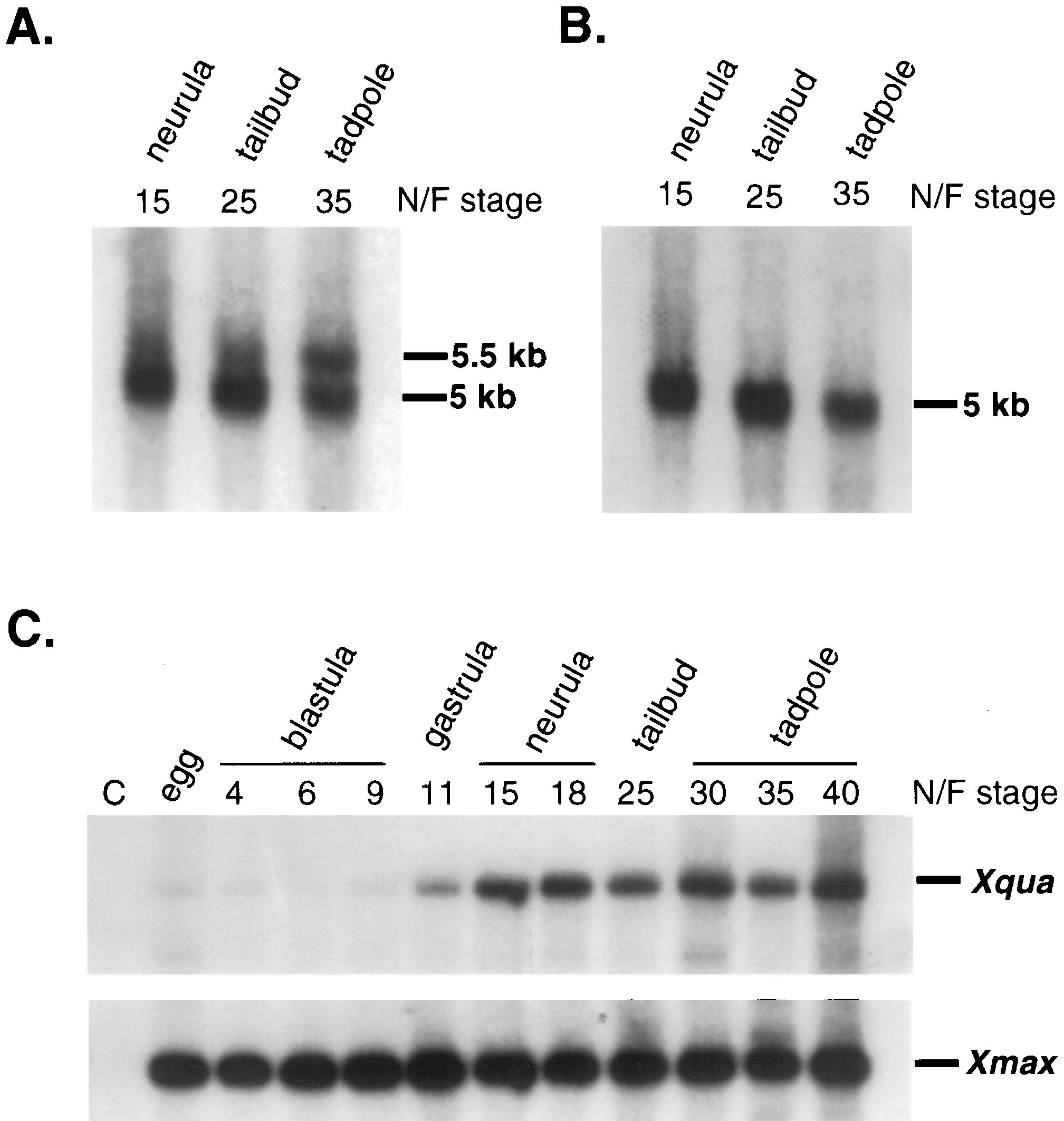 Detection of quaking sequences in Xenopus embryonic mRNA. (A) Northern blot analysis of 10 μg poly(A)+RNA from Xenopus neurula, (stage 15), tailbud (stage 25) and tadpole (stage 35) embryos, probed with Xenopus quaking sequences detects two transcripts 5 kb and 5.5 kb in length. The probe cDNA fragment is derived from the coding region and spans the KH domain (nt 1â1718). (B) The same RNA blot probed with Xqua cDNA fragments derived from the 3â² UTR (nt 1718â2240 or nt 2450â3020), detects only the 5 kb mRNA. (C) Expression profile of the 5 kb Xqua transcript. Total RNA from five embryos at each stage was analyzed by RNase protection, using probe specific for the 5 kb Xqua transcript (nt 2046â2240), or probe for the control sequence XMax, which is expressed at constant levels throughout development ( Tonissen et al., 1994). Total RNA was isolated from Xenopus eggs and embryos as described by Melton and Cortese (1979)and purified further by precipitation with 4 M LiCl. Northern blot analysis was performed using random primed probes from three different Xqua cDNA fragments: (1) Xqua, NotI-EcoRI fragment, nt 1â1718; (2) Xqua, EcoRI fragment, nt 1718â2240; (3) Xqua, HindIII fragment, nt 2450â3020. Plasmid for generating Xqua 5 kb specific, antisense RNA probe was constructed by inserting a 520 bp EcoRI Xqua fragment (nt 1718â2240) into pBluescript SK (Stratagene). The template was linearized with PvuII and 32P-labeled probe was transcribed using T7 RNA polymerase. RNase protection assays were performed as described by Krieg and Melton (1987)with the Xqua probe and probe from the XMax-2 template, p4Z.MaxAH ( Tonissen and Krieg, 1994).