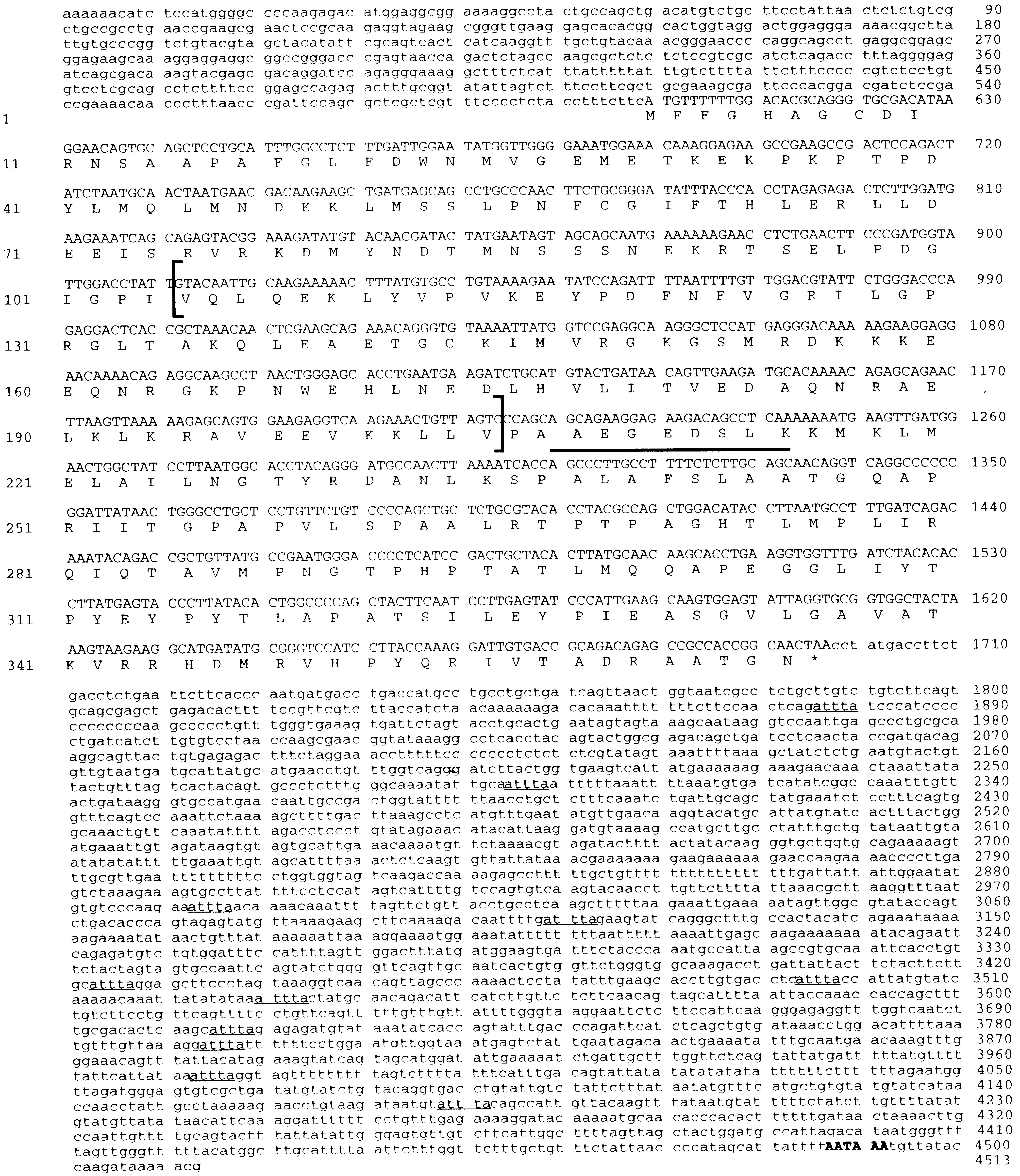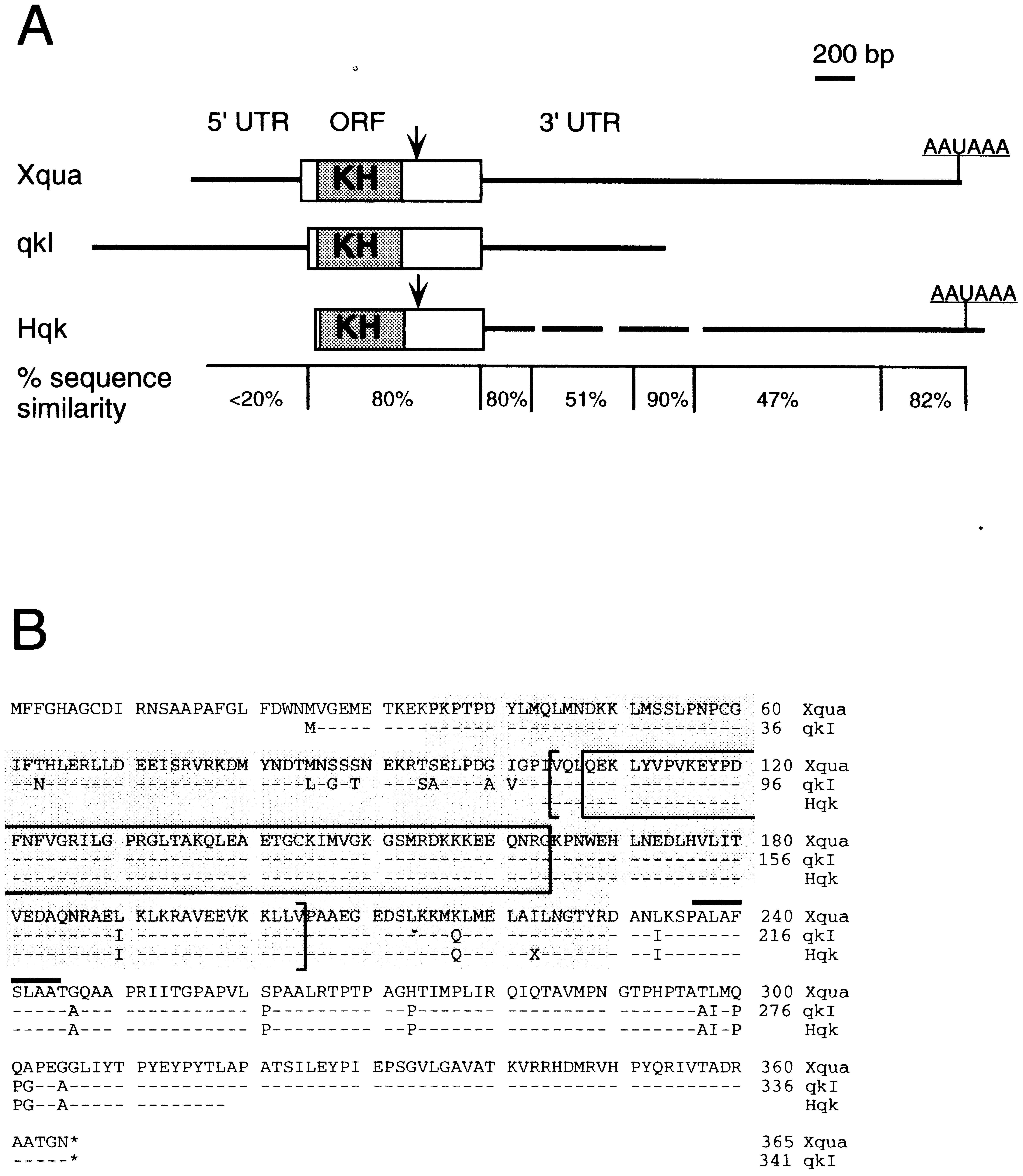 Full length Xqua cDNA sequence. The 5′ and 3′ UTR sequences (in lower case) are 599 nt and 2819 nt long respectively, with an ORF of 1095 nt (in upper case). The conceptual translation of the ORF is presented below. The extended KH domain is contained in parentheses. The 24 nt alternatively spliced sequence has a bold line over it. The 3′ UTR contains eleven putative mRNA destabilizing sequences, AUUUA ( Shaw and Kamen, 1986; Wilson and Treisman, 1988), which are underlined. A polyadenylation signal sequence (AAUAAA) is indicated in bold upper case. Clones containing Xqua sequences were initially identified using a 1.1 kb fragment of the mouse qkI coding region to probe 106 clones from a stage 30 Xenopus head cDNA library ( Hemmati-Brivanlou et al., 1991). Hybridizations were performed in 40% formamide, 1 M NaCl, 1% SDS, 50 mM Tris-HCl (pH 7.6), 5×Denhardt's and 100 μg/ml herring sperm DNA, at 42°C. Filters were washed at moderate stringency, in 2×SSC/0.1% SDS at 55°C. Exonuclease III digestion (Erase-a-Base, Promega) was used to make nested deletions of overlapping Xqua cDNA clones and sequence was determined by chain-termination sequencing ( Sanger et al., 1977) of both strands of the Xqua cDNA.