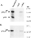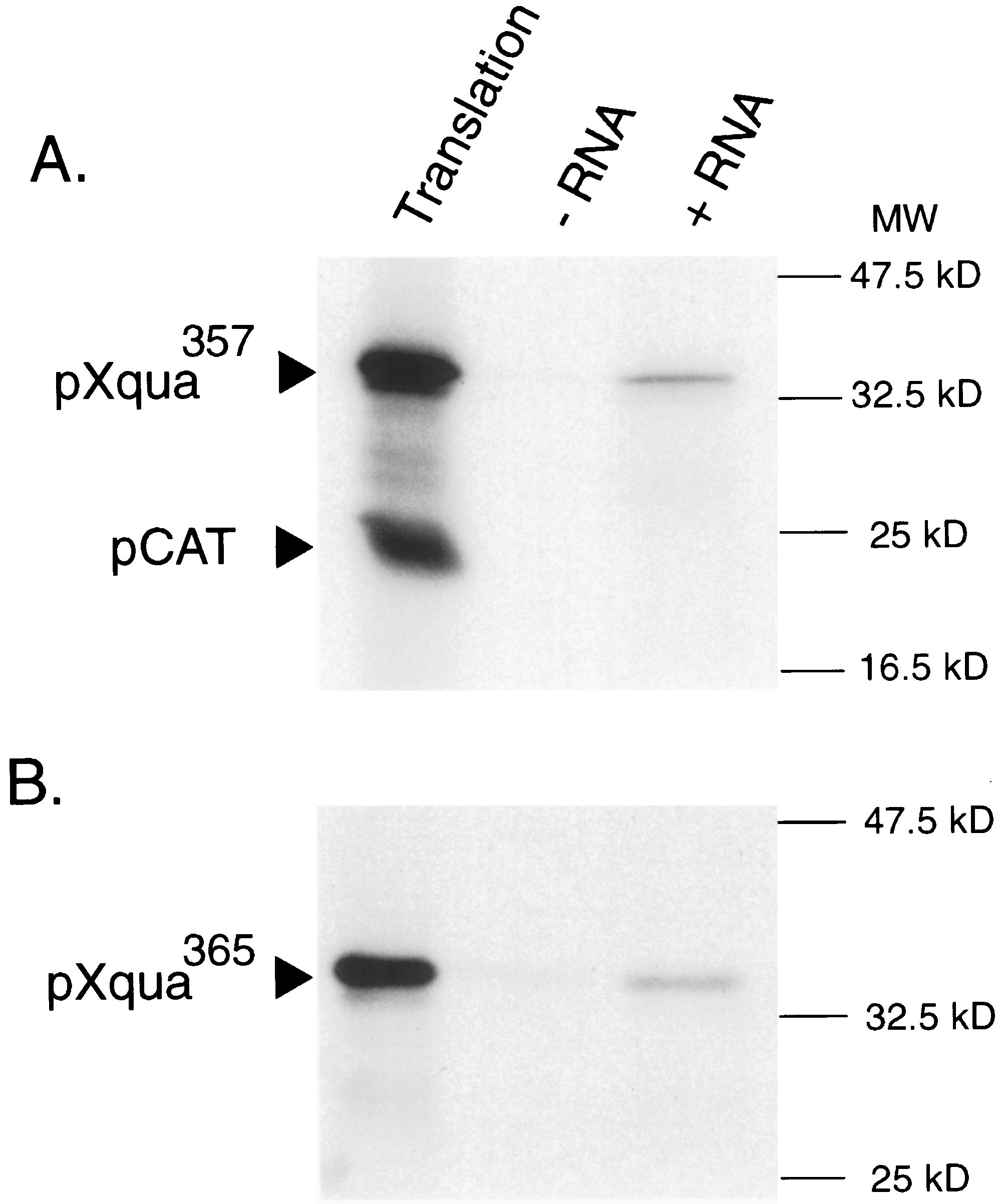 pXqua binds RNA in vitro. Binding of (A) pXqua357 and (B) pXqua365 to RNA in vitro. Synthetic mRNA encoding pXqua357 or pXqua365 was translated in vitro in reticulocyte lysates in the presence of [35S]methionine. An amount equal to 20% of the protein(s) used in each binding reaction is shown in the track marked translation. 35S-labeled proteins were bound to 30 μg of total Xenopus embryonic RNA-agarose (track labeled +RNA) in buffer containing 100 mM NaCl. As a control, an equal amount of protein was bound to agarose beads that were not coupled to RNA (track labeled −RNA). After extensive washing, protein retained on the RNA-agarose was analyzed by SDS-PAGE using a 12.5% gel and visualized by fluorography. The control CAT protein did not bind to the RNA-agarose. To generate labeled protein for RNA-binding studies, sequences encoding pXqua357 and pXqua365 were inserted into pT7TS vector (a modified version of pSP64T, Krieg and Melton, 1987). pT7TS-Xqua templates were linearized with BamHI and capped mRNA was produced using the Ambion Message Machine kit. Approx. 100 ng of synthetic mRNA encoding pXqua357, pXqua365 or pCAT (control sequence provided by BRL) was translated in vitro in the presence of [35S]methionine, using reticulocyte lysate (Ambion). To generate RNA-agarose, total Xenopus embryonic RNA at 1 mg/ml in water was biotinylated using photo-activated biotin-acetate (Vector Labs) according to the manufacturer's instructions. The RNA-biotin was then mixed with streptavidin-agarose resin (BRL) to a final concentration of 1–2 μg of RNA per 1 μl of agarose resin. RNA binding of in vitro translated proteins was assayed essentially as described by Swanson and Dreyfuss (1988)using approx. 105 dpm of labeled protein and 30 μl RNA-agarose resin. Proteins bound to the RNA-agarose were released by addition of SDS-protein loading buffer, boiled, and then resolved by SDS-PAGE and visualized by fluorography. In each experiment, control binding reactions were carried out with streptavidin-agarose (inactivated) that was not coupled to RNA.