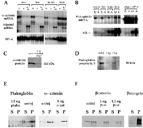 four lanes uninjected embryos compared to embryos injected with 5 ng of oligo A3 and probed with a-catenin antibody. (F) Left-hand six lanes,