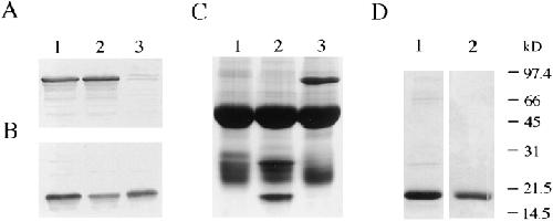 Figure 2. Gels of immunodepletion of XAC and gelsolin from Xenopus laevis egg extracts and purified XAC and ADF. (A and B) Immunoblots of immunodepleted extracts using antibodies to gelsolin (A) and XAC (B). For both A and B, lane 1 is the IgG-depleted control, lane 2 is the XAC-depleted extract, and lane 3 is the gelsolin-depleted extract. Quantitation of the depletion was performed by densitometry of the bands in A and B compared to a dilution series of pure extract. (C) Coomassie blue–stained SDS-PAGE gel of immunoprecipitated complexes with XAC and gelsolin antibodies. Lane 1, the heavy and light chain of random rabbit IgG alone; lane 2, XAC (19 kD) and another band at approximately 28 kD over the IgG heavy and light chain bands; lane 3, gelsolin (∼93 kD) over the IgG bands. (D) Coomassie blue–stained SDS-PAGE shows the purity of the recombinant XAC and chicken ADF mutant that were added back to the XAC immunodepletions. Lane 1, wild-type XAC; lane 2, S3E ADF. Apparent molecular mass markers for all gels are indicated on the right.