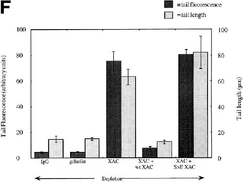 Figure 3. Listeria tail formed in XAC- or gelsolin-depleted Xenopus egg extracts. Actin tails are visualized by mixing rhodaminelabeled actin to Listeria and the following extracts: (A) IgG- depleted extracts, (B) gelsolin-depleted extracts, (C) XAC- depleted extracts, (D) XAC-depleted extracts plus 2.7 μM pure wild-type XAC, and (E) XAC-depleted extracts plus 2.7 μM pure S3E ADF. (F) Bar graph quantitating the amount of tail fluorescence (left side, ▒⃞ ▒⃞ ) and tail length (right side, ░⃞ ) using Winview software. The number of tails analyzed for IgG depletion was 33, for gelsolin depletion, 29, for XAC depletion, 43, for wildtype XAC addback, 25, and for S3E ADF addback, 11, over seven experiments using two separate extracts preps. Error bars represent standard deviation of the mean. Bar, 10 μm.