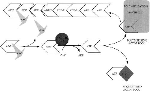 Figure 7. Model for recycling of actin by ADF/cofilin proteins. At areas of high filament turnover in the cell, ATP-bound actin is induced to polymerize by a complex of proteins. The ATP within the filament is hydrolyzed and the terminal phosphate is slowly released. The resulting ADP-containing subunits have weaker interactions with each other than those containing ATP. These subunits are now available for depolymerization by the ADF/cofilin family of proteins (XAC). Once XAC depolymerizes an actin subunit(s), it dissociates from actin. The released actin must exchange its ADP for ATP and the nucleotide exchange is probably catalyzed by profilin. The ATP-bound actin is then either repolymerized or sequestered for later use.