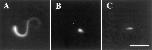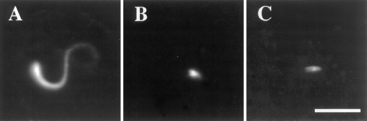 Figure 4. Listeria tails resulting from addition of excess XAC to Xenopus egg extracts. (A) Actin tail resulting from adding extract buffer to Xenopus egg extracts. (B) Actin tails resulting from adding wild-type XAC to extracts to 7.1 μM. (C) Actin tails resulting from adding wild-type XAC to 12.1 μM. (D) Quantitative analysis of the amount of tail fluorescence (left side, ▒⃞ ░⃞ ) and tail length (right side, ░⃞ ) using Winview software. The fluorescence units differ from those in Fig. 3 because the images were analyzed at different magnifications. The number of tails analyzed for buffer alone addition was 15, for XAC addition to 7.1 μM, 29, and for XAC addition to 12.1 μM, 33, over three experiments using two separate extract preps. Error bars represent standard deviation of the mean. Bar, 10 μm.