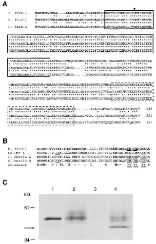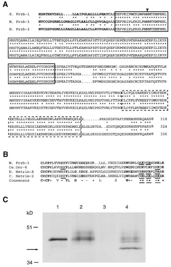 Figure 2. Frzb-1 Is a Secreted Protein Containing a Frizzled-like CRD and a FUN Domain (A) Deduced amino acid sequences of the Xenopus, mouse, and human Frzb-1 proteins. Amino acid identity between frog and mouse or frog and human is indicated by an asterisk. The predicted signal peptide and the 10 cysteines typical of the extracellular cysteine-rich domain (CRD) of frizzled genes are shown in bold. The CRD is boxed, and the potential N-linked glycosylation site is indicated by an arrowhead. Outside the CRD, another region of Frzb-1 that shows homology to the Unc-6 and Netrin proteins, designated the FUN domain, is indicated by the dashed box. (B) Alignment of the FUN domains of mouse Frzb-1, C. elegans Unc-6, Drosophila Netrin-A, and chick Netrin-2. Residues identical in all four proteins and conserved acidic or basic residues are shown in bold; conserved residues in 3 of the 4 proteins are included in the consensus sequence. Dibasic sets of residues indicative of possible proteolytic cleavage sites are underlined. (C) [35S]Frzb-1 protein synthesized in vitro (rabbit reticulocyte, lane 1) or in vivo (culture supernatant of injected frog oocytes, lane 2) run on an SDS–PAGE gel. Treatment of the in vivo–synthesized protein with N-glycosidase A (lane 4) shows a shorter band (arrow), indicating signal peptide processing and possible carboxy-terminal cleavage of Frzb-1 (see text). Uninjected oocyte supernatant is shown in lane 3. |