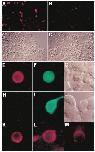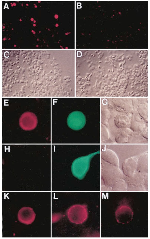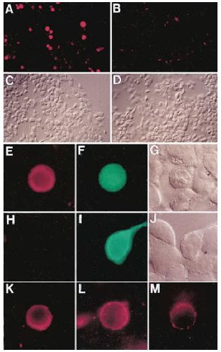 Figure 6. Frzb-1 Protein Binds to Cells Expressing a Wnt-1/Transmembrane Chimera (A) Low magnification view of 293 cells transfected with a Wnt1CD8 construct expressing Wnt-1 tethered to the membrane. After incubation in conditioned medium containing 250 nM Frzb1–HA protein and staining with anti-HA, positive cells appear as red spots. (B) Cells transfected with the plasmid coding for truncated Chordin protein (pΔ-Chd), used here as a negative control. (C) The same field of view as in (A) in Nomarski optics. (D) Nomarski view of the same cells as in (B). (E) High power view of a culture co-transfected with Wnt1CD8 and LacZ in pcDNA3. (F) The same cell that binds Frzb1–HA (red in panel E) also expresses LacZ from the cotransfected plasmid (in green). (G) Nomarski view of the same field as in (E) and (F). (H) Cells cotransfected with the full-length CD8 control as well as LacZ plasmid and treated with the Frzb1–HA medium shows no specific staining. (I) The same cells as in panel (H) are shown after staining for β-galactosidase (in green). (J) The same field of cells as in (H) and (I) is shown using Nomarski optics. (K) Binding of Frzb1–HA (250 nM) performed at 4°C for 2.5 hr on Wnt1CD8-transfected cells stained with anti-HA (in red). (L) Incubation of cells expressing Wnt1CD8 chimera with Frzb1–HA diluted down to 125 pM. (M) Cell transfected with a mutant Wnt1CD8 (cysteine 369 mutated to tryptophan) that reduces its biological activity is able to bind diluted Frzb1–HA (125 pM). This experiment was carried out simultaneously to the one illustrated in (L) but exposure time was four times longer. Stained cells in (K)–(L) were GFP positive (data not shown). All pictures were taken on a Zeiss Axiophot microscope with 40X (A–D) or 100X objectives (E–M). Photos were taken with a Kodak Ektachrome P1600 film and printed photographically. |