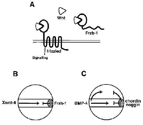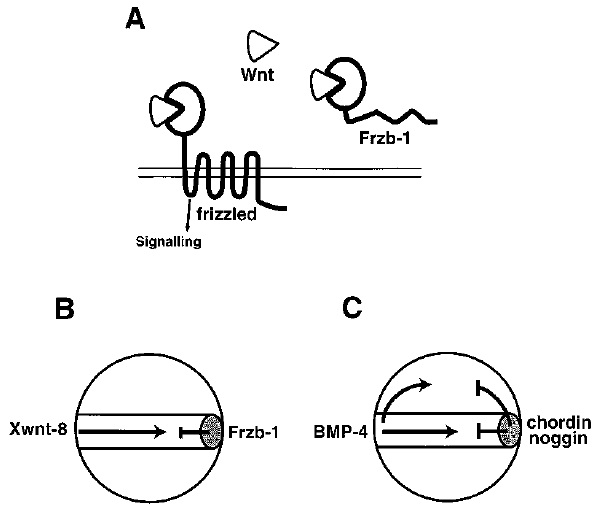 Figure 7. Speculative Model for the Mechanism of Frzb-1 Function (A) Frzb-1 competes with frizzled receptors for the binding of Wnt factors. Frzb-1 and frizzled share a homologous cysteine-rich domain (PacMan shape) that is responsible for Wnt binding. (B) Diagram of the possible function of Frzb-1 during Xenopus gastrulation. Frzb-1 is secreted by the Spemann organizer (gray oval) and antagonizes Xwnt-8, which is involved in patterning mesoderm in the ventrolateral marginal zone. (C) Other organizer-specific inhibitory factors involved in patterning the mesoderm and neuroectoderm. BMP-4 is secreted by the ventral side of the embryo and is antagonized by chordin and noggin which directly bind to it in the extracellular space of ectoderm and mesoderm. In this view, the Spemann organizer would be a source of inhibitory secretory proteins. |