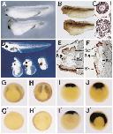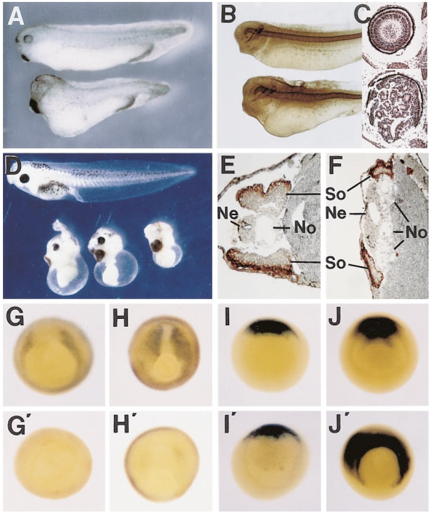 Figure 3. frzb-1 mRNA Inhibits Skeletal Muscle Formation and Enhances Dorsoanterior Structures (A) Top, control embryo. Bottom embryo was injected into the vegetal pole with 200 pg of synthetic frzb-1 mRNA into each of the four blastomeres and allowed to develop to stage 36. Note the enlarged cement gland and shortening of the body in this dorsalized embryo. (B) Similar embryos after immunostaining with an antibody (MZ-15) labeling the notochord; the notochord is thickened in the frzb-1 dorsalized embryo. (C) Histological section through the eye of a normal embryo (top) and of an embryo injected as in (A) (bottom). The retina of the dorsalized embryo is folded multiple times, filling the enlarged eye. (D) Microinjection of frzb-1 mRNA into the marginal zone (400 pg/cell) leads to inhibition of trunk formation (bottom embryos). (E) Uninjected tadpole sectioned at the trunk level after staining with the skeletal muscle marker 12/101. (F) Sibling embryo injected with 250 pg/cell of frzb-1 mRNA into the marginal region of each of the four blastomeres. Note the decrease in the amount of 12/101 positive muscle and increase in notochord tissue ([So], somite; [No], notochord; [Ne], neural tube). (G) In situ hybridization at stage 103/4 showing expression of XMyoD in prospective skeletal muscle cells. (Gâ²) frzb-1 mRNA inhibits XMyoD expression. (H and Hâ²) Expression of XMyoD at late gastrula (stage 12 1/2) is inhibited by frzb-1 mRNA microinjection. (I and Iâ²) Early expression (stage 10 1/2) of the organizer marker chordin is unaffected by frzb-1 ectopic expression. (J and Jâ²) Late gastrula expression of chordin mRNA (stage 12 1/2) is expanded into the lateral marginal zone in frzb-1-injected embryos. |