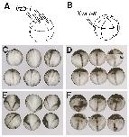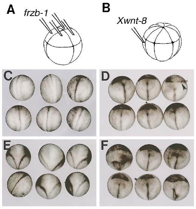 Figure 5. Noncell-Autonomous Antagonism of Xwnt-8 by frzb-1 (A) Experimental design showing embryos injected with frzb-1 synthetic mRNA into the four animal blastomeres at the 8-cell stage. (B) Injection of Xwnt-8 synthetic mRNA into a single ventrovegetal blastomere at the 16–32 cell stage. (C) Dorsal view of uninjected siblings at neurula (stage 19). The anterior end is at the top, the neural tube is visible. (D) Sibling embryos injected with frzb-1 (200 pg/cell) mRNA as in (A). Note the single neural tube and the considerable enlargement of the cement gland at the anterior end (arrowhead), indicating dorsalization. (E) Embryos injected with Xwnt-8 (4 pg) synthetic mRNA as in B. The Y-shaped neural tube indicates the formation of a double axis. (F) Sibling embryos injected successively with frzb-1 mRNA in the animal cap and later with Xwnt-8 mRNA into a ventro-vegetal blastomere to reveal extracellular antagonism. Note that the embryos show a single axis; the Xwnt-8 phenotype was antagonized, but the dorsalization by frzb-1 (enlarged cement gland) is still present. |