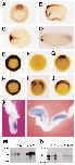 Figure 1. frzb-1 mRNA Expression in Xenopus, Mouse, and Human (AâD) Double-labeled in situ hybridization of Xenopus embryos showing frzb-1 (blue) and chordin expression (brown). (A) shows the vegetal view at stage 11; (B), lateral view of stage 13 embryo; (C), dorsal view of the same embryo; and (D), tailbud stage embryo. (EâJ) Expression of frzb-1 in manipulated embryos. (E) shows the vegetal view of a Xenopus gastrula dorsalized by LiCl treatment; (F), Xenopus gastrula ventralized by UV irradiation; (G), vegetal view of an untreated embryo (stage 10 1/2); (H), Vegetal view of an embryo (stage 10 1/2) radially injected with siamois RNA; (I), frzb-1 expression in a stage 10 1/2 embryo radially injected with activated Xlim1 RNA; and (J), frzb-1 expression in a stage 10 1/2 embryo radially injected with goosecoid RNA. (K) Mouse gastrula (midstreak stage) showing frzb-1 expression in the primitive streak. (L) Mouse embryo (8.5 day) frzb-1 expression in the foregut diverticulum (arrowhead), nervous system, and posterior mesoderm. (MâN) Northern blot of adult mouse tissue (M) and human tissue (N) showing frzb-1 expression in heart (H), brain (B), spleen (S), skeletal muscle (M), kidney (K), testis (T), placenta (Pl), and pancreas (Pa). frzb-1 is detected at very low levels in lung (Lu) and liver (Li). |