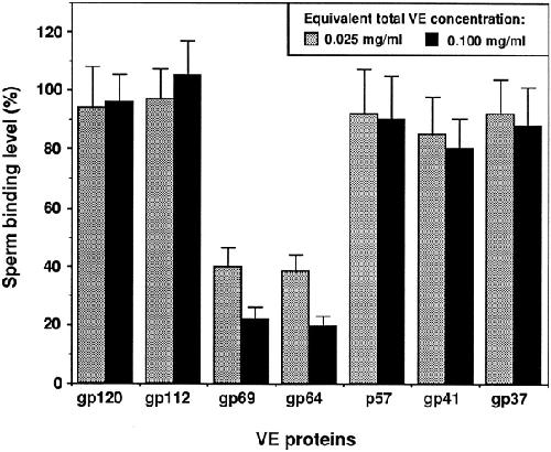 Figure 3. Effects of purified individual VE proteins on sperm-egg binding. The final concentration of each protein tested was equivalent to its concentration in either 25 or 100 μg/ml of total VE protein. The percentage of each of the proteins in the isolated X. laevis VE has been reported to be: gp120 (6.2 ± 1.5%), gp112 (6.5 ± 1.4%), gp69 (1.9 ± 0.8%), gp64 (2.6 ± 0.6%), p57 (0.9 ± 1.2%), gp41 (43 ± 2%), and gp37 (39 ± 5%) (Hedrick and Hishihara, 1991). Bars represent SD with n = 15 eggs.