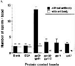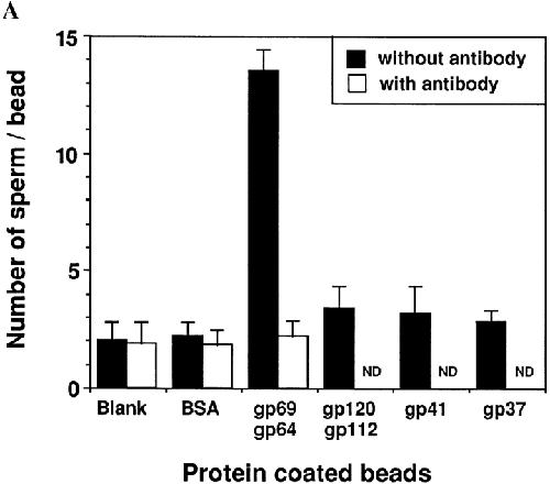 Figure 5. Sperm binding to agarose beads containing coupled proteins. The sperm-bead binding assay was carried out as described in Materials and Methods. (A) Quantitation of the average number of sperm bound to beads containing various covalently coupled proteins. Binding was measured in the absence or presence of 70 μg/ml of polyclonal anti-gp64 antibody (which recognized both gp64 and gp69). Approximately 0.3–0.4 nmol of protein was coupled per mg of beads. Bars represent SD with n = 30 beads. The effects of the anti-gp64 antibody on gp120/112, gp41, gp37 were not determined (ND). (B) Fluorescence micrographs of sperm binding to beads coated with a 1:1 mixture of gp69 and gp64 (a) or BSA (b). Bar, 20 μm.