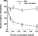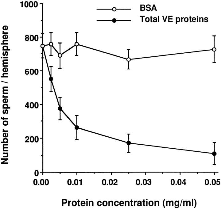 Figure 2. Dose-dependent inhibition of sperm-egg binding by heat-solubilized total VE proteins. The sperm binding competition assay was carried out as described in Materials and Methods. Bars indicate the standard deviation (SD) with n = 15 eggs.