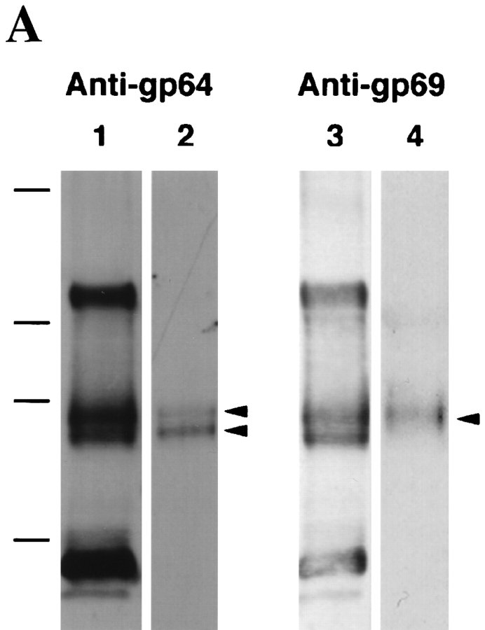 Figure 4. Polyclonal anti-gp64 and anti-gp69 antibodies and their effects on sperm-egg binding. (A) The specificity of the polyclonal anti-gp69 and anti-gp64 antibodies. Total VE proteins (0.8 μg/lane) were separated by SDS-PAGE, transferred to nitrocellulose membranes, and immunoblotted with the DEAE-cellulose purified anti-gp64 (lane 1) or anti-gp69 (lane 3), or with preadsorbed anti-gp64 (lane 2) or anti-gp69 (lane 4). The two bands in lane 2 indicated by arrows are gp69 and gp64, respectively. The band in lane 4 indicated by the arrow is gp69. Molecular weight standards are marked on the left. From top: 216, 97, 71, and 44 kD. (B) The effects of the pre-adsorbed polyclonal anti-gp64 and anti-gp69 antibodies on sperm-egg binding. The horizontal axis represents the antibody concentration in the MR solution in which the eggs were preincubated. Bars represent SD with n = 15 eggs.