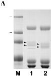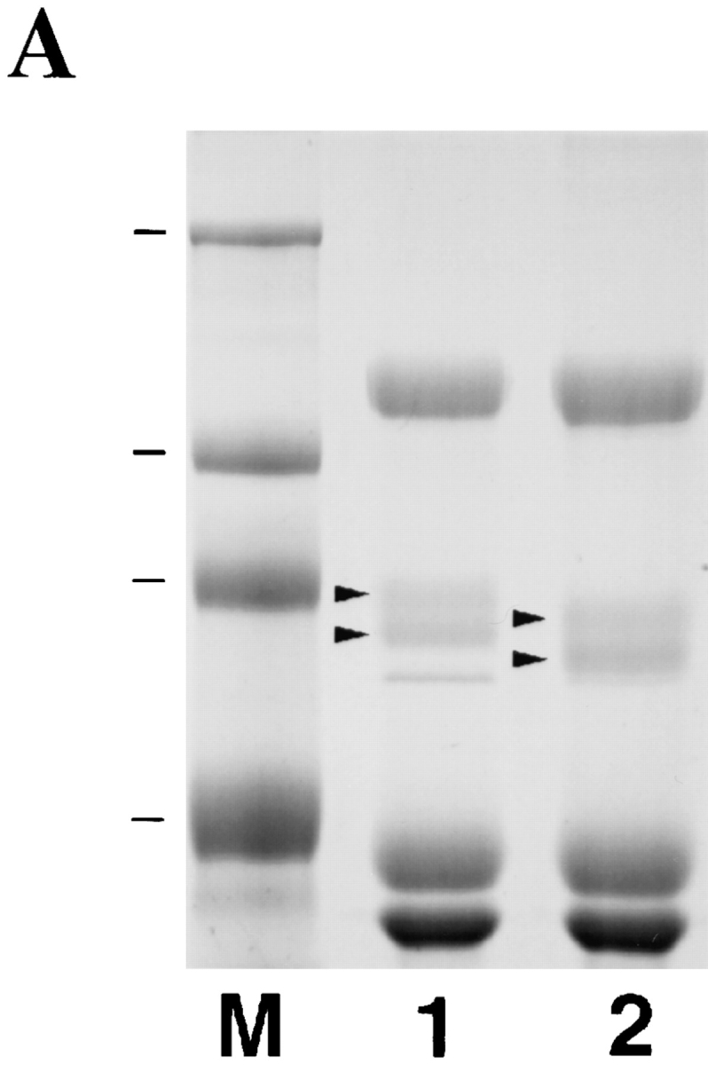 Figure 6. Effect of crude type I collagenase on the VE proteins and on sperm-egg binding. (A) SDS-PAGE analysis of total VE proteins isolated from a control group of eggs (lane 1) or from eggs treated with crude type–I collagenase (lane 2). The gel was stained with Coomassie blue. Molecular weight standards are marked and shown in lane M. From top: 216, 97, 71, and 44 kD. Arrows in lane 1 indicate gp69 and gp64, respectively. Arrows in lane 2 indicate the two bands at ∼65 and 60 kD which are derived from gp69 and gp64, respectively. (B) Sperm binding levels to control eggs (lane 1) or type I collagenase–treated eggs (lane 2). Bars represent SD with n = 15 eggs.