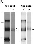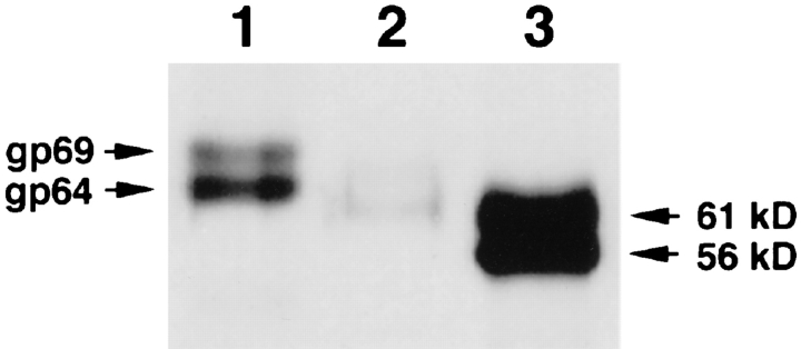 Figure 8. Effect of PNGase F treatment on gp69/64. Purified gp69 and gp64 (total 1 μg , lane 1) and PNGase F–treated gp69/64 (total 10 μg, lane 3) were separated by 7.5% SDS-PAGE, electrotransferred to membrane, and immunoblotted with specific anti-gp69/64 antibody. The band in lane 3 was much more intense because 10 times as much protein was loaded. The molecular masses of the two bands are marked on the right. Lane 2 shows the 65-kD and 60-kD bands (total 1 μg) generated from crude collagenase digestion of gp69/64.