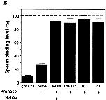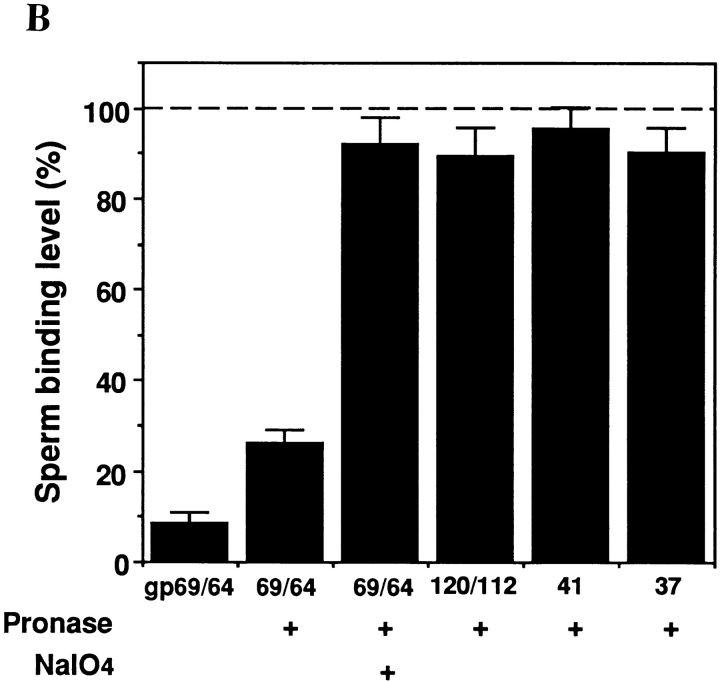 Figure 7. Possible role of carbohydrates on sperm binding. (A) Effect of metaperiodate treatment on sperm binding to live eggs. (B) Effects of Pronase-digested VE glycopeptides on sperm-egg binding. A total of 5 μg of gp69/64 (1:1) and proportional amounts of other VE proteins were used according to the ratio indicated in Fig. 3. The sperm binding level in the presence of an equal amount of heat-inactivated Pronase was used as a control and designated as 100%. Bars represent SD with n = 15 eggs.