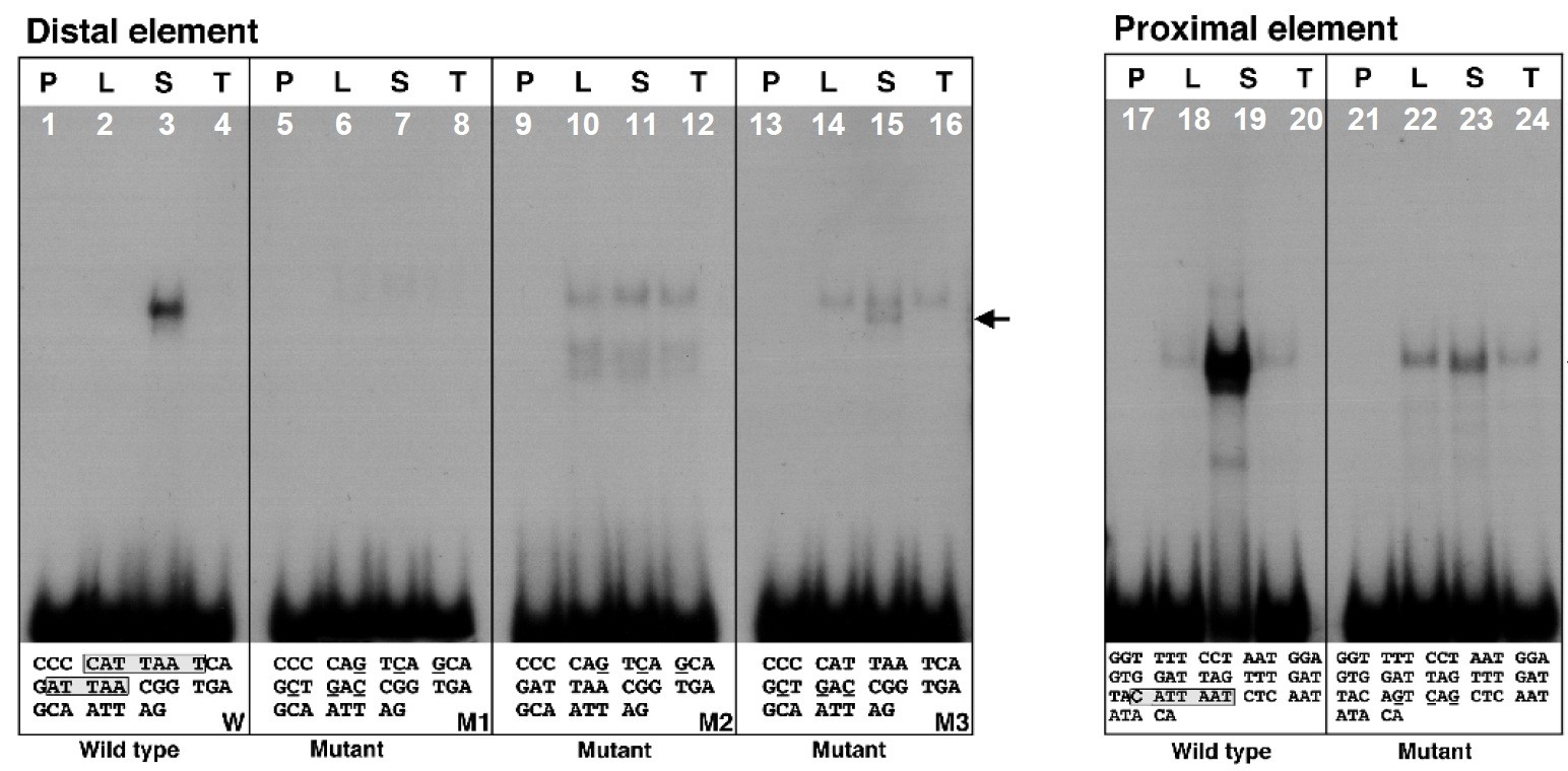 in SP64T. The wild-type and mutant sequences of the distal and proximal elements were previously characterized (Watabe et al., 1995).