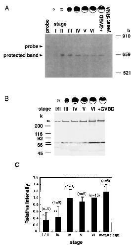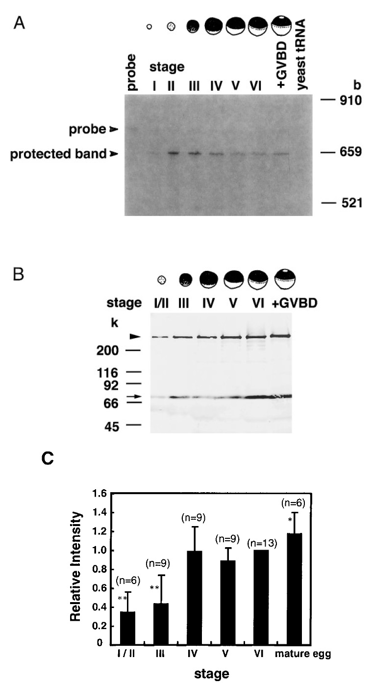 to one oocyte was loaded onto 5% SDS- PAGE. Arrowhead