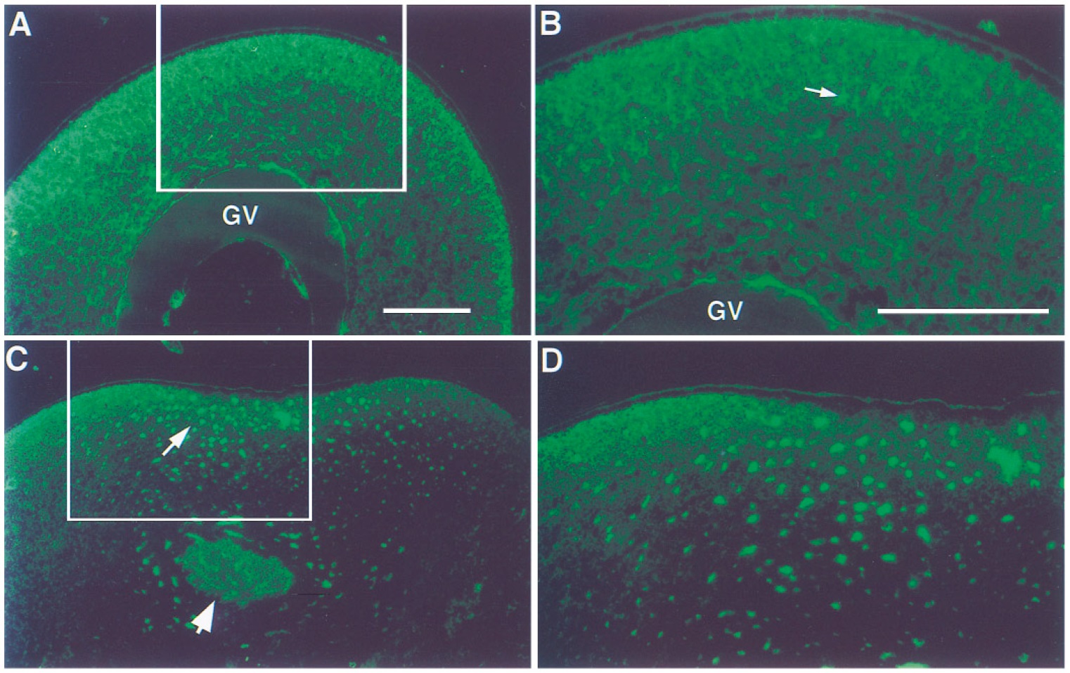 (large arrow). GV, germinal vesicle. Scale bar, 100 mm, A to D.
