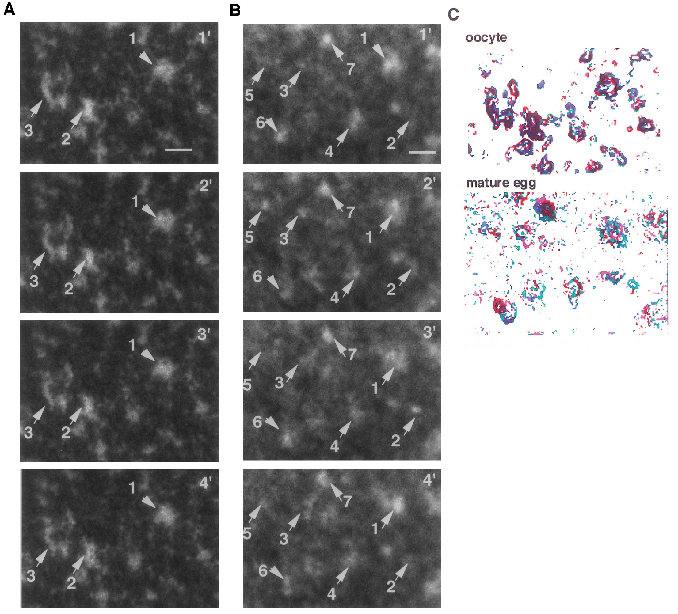 oocyte surface. Arrows of the same number show the same spots during the respective time sequences. Comparison of specific bright