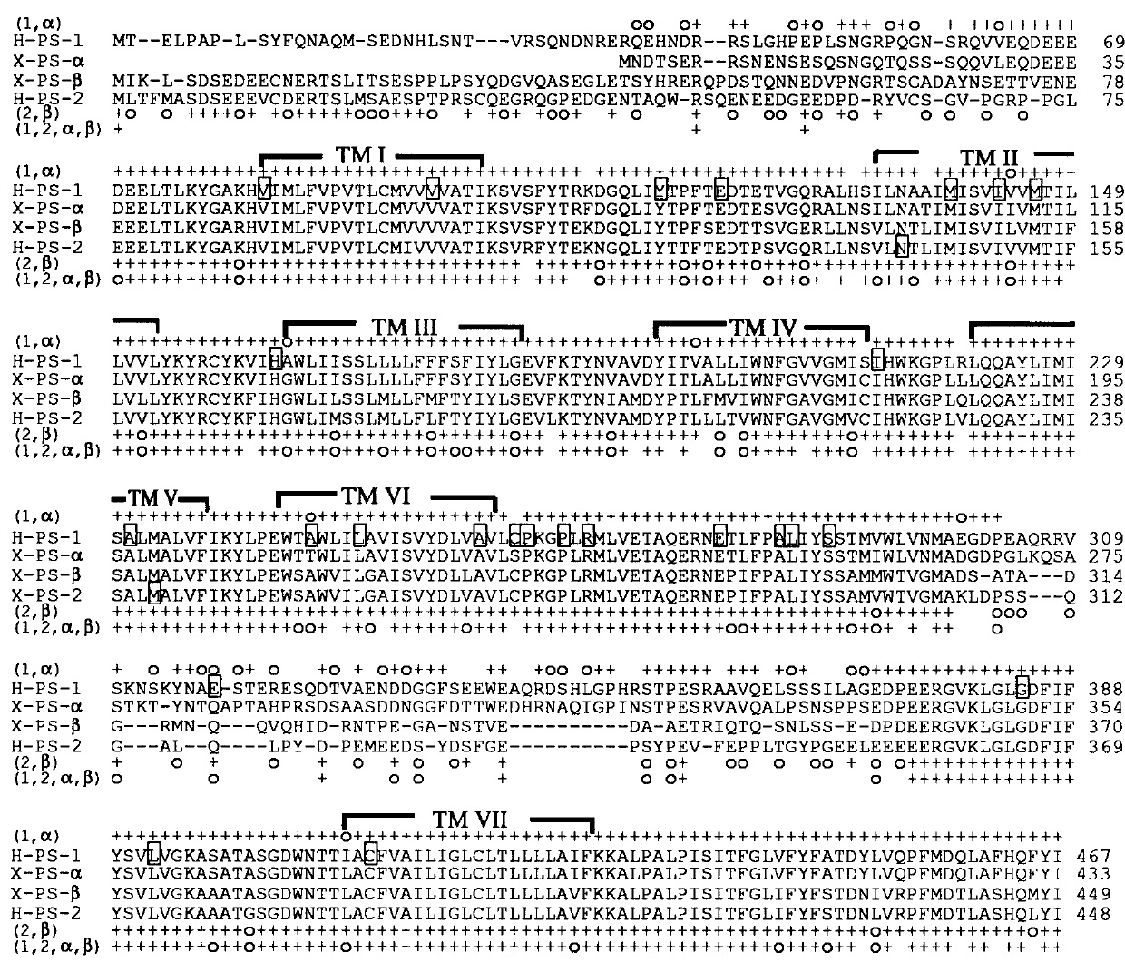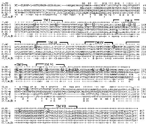 indicate positions for identical or conservedly substituted aa residues between H-PS-1 and X-PS-a (1, a), between H-PS-2 and X-PS-b (2,