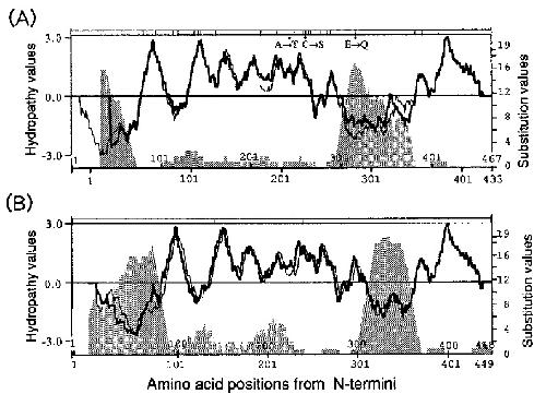 FIG. 3. Hydropathy and amino acid substitution profiles. Based