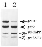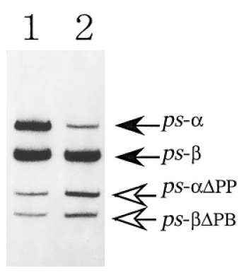 open arrows indicate positions of amplified DNAs originating from X-ps-a, X-ps-b transcripts and those of corresponding competitor DNAs,
