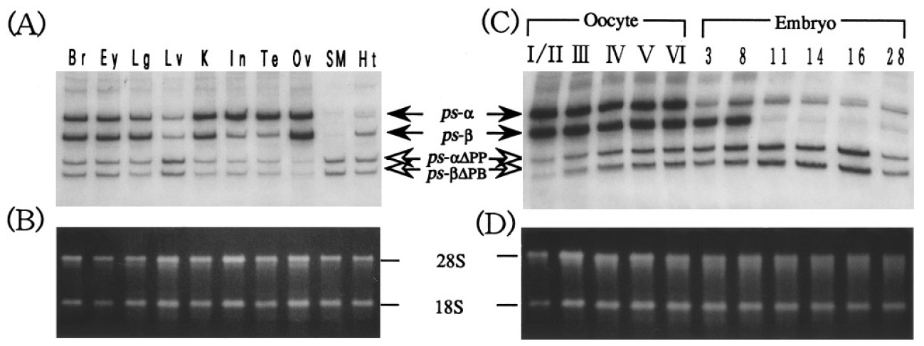 FIG. 4. Tissue and developmental stage-specificity of X-ps-a and X-ps-b gene expression. Competitive RT-PCR was conducted as described