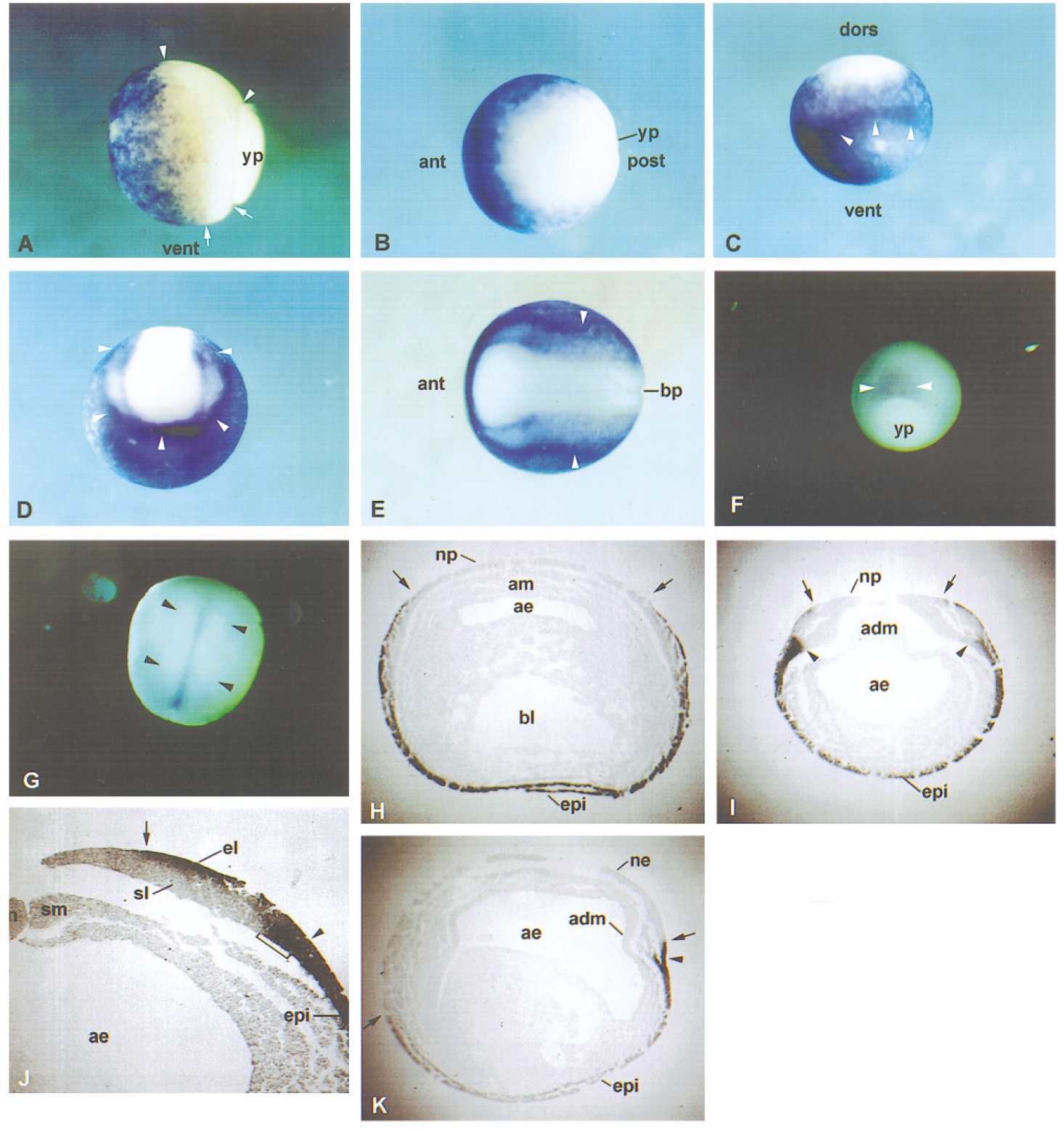 for XHL mRNA. The dorsal border of XHR expression is marked by arrowheads. H: Cross-sections of a late gastrulaembryo prior subjected
