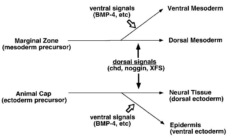 FIG. 1. Dorsal and ventral signals change the fate of tissues by providing varying dorsal– ventral positional information (Sasai et al., 1995). (A) The dorsal signals from the frog organizer, chordin, noggin, and follistatin (XFS) act on both marginal zone cells (meso-dermal precursors) and animal cap cells (ectodermal precursors) and induce dorsal-type tissues: dorsal mesoderm (notochord and muscle) and neural tissues, respectively. Ventral signals such as BMP-4 also change the fate of both mesodermand ectoderm, gener-ating ventral mesoderm (blood, mesothelium, and mesenchyme) and epidermis. Thus, the same set of antagonizing regulatory signals, the organizer factors vs BMP-4, can pattern both germ layers.