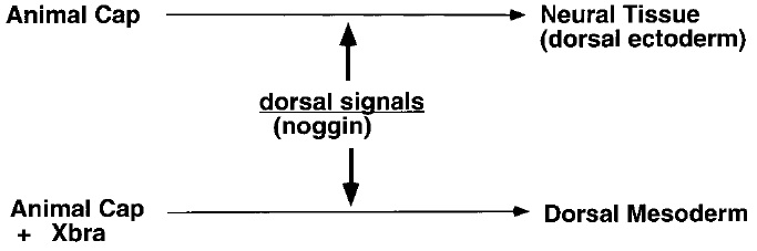 FIG. 2. Experiment by Cunliffe and Smith (1994) illustrating how a differential response to the same signal can be generated. Animalcaps treated with noggin became neural. When animal caps were injected with Xbra, a mesoderm-specific transcription factor, the explants became dorsal mesoderm in response to the same noggin signal.