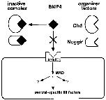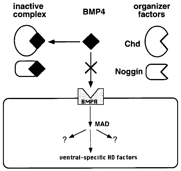 FIG. 3. The organizer factors inactivate BMP-4 by binding it in the extracellular space. Both chordin and noggin bind to BMP-4 and inhibit BMP-4 protein from binding to its own receptor. Down-stream of the BMP receptor, the vertebrate homologue of Drosoph-ila mother against dpp (MAD) seems to play a fundamental role in the signal transmission to the nucleus. Among the target genes in the BMPR signaling pathways are ventral-specific homeodomain (HD) proteins. Both MAD and ventral HD factors can mimic the ventralizing activity of BMP-4 by microinjection.