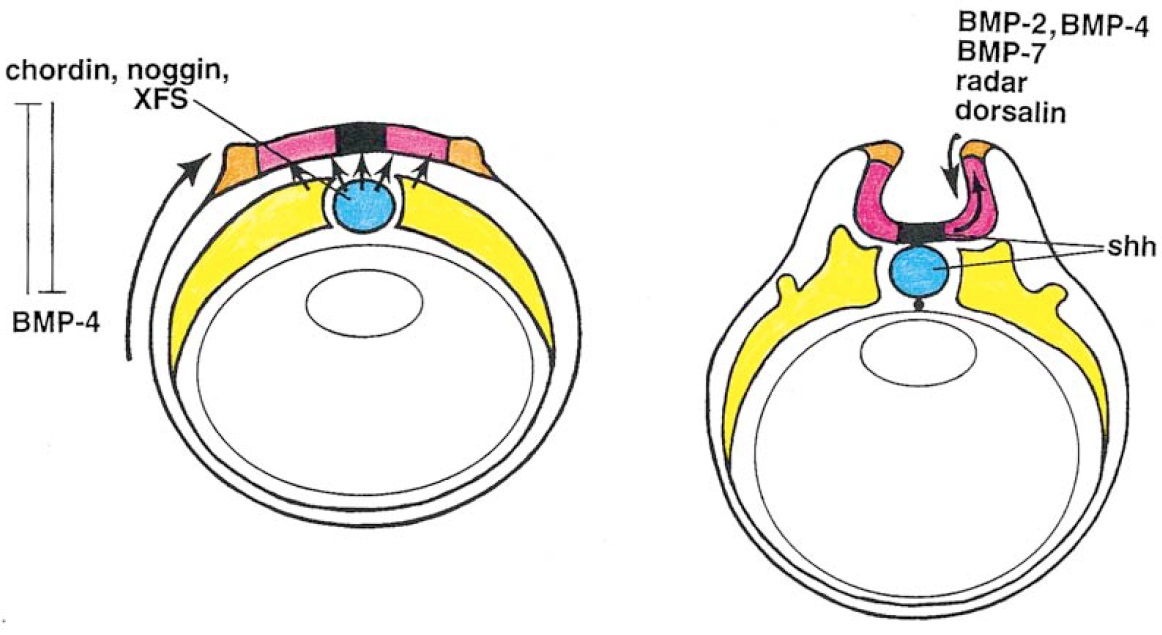 concentrations BMP-4 leads to skin development (ventral ectoderm). At the late neurula stage (left), the notochord and floor plate produce