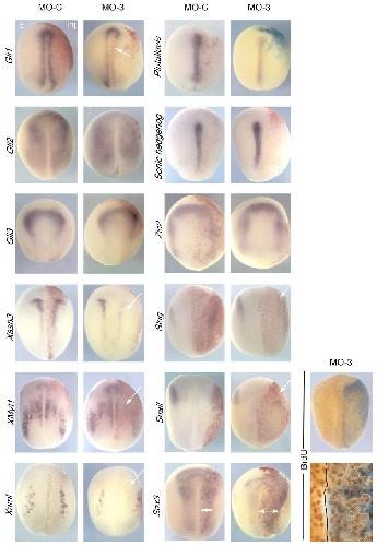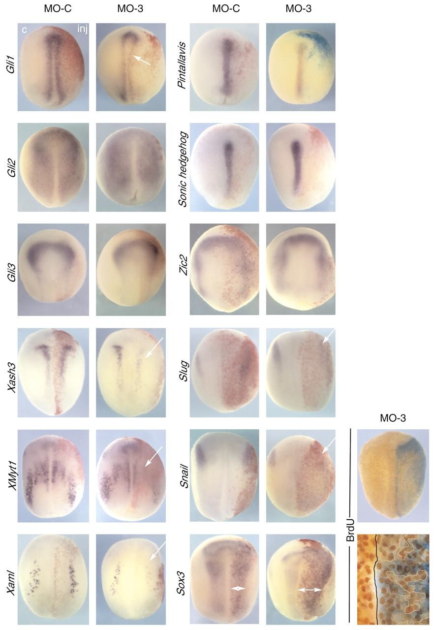 Fig. 2. Effects of Gli3 in neural plate patterning. Whole-mount in situ hybridizations on stage 14 embryos injected (inj.) with MO-C or MO-3 with probes as indicated on the left side of each panel. The β-gal tracer is red except in Pintallavis-MO-3 and the BrdU panels, in which it is blue. Arrows indicate the inhibition of Gli1, Xash3, XMyt1, Xaml, Slug and Snail expressions. Double-headed arrows indicate the size of the neural plate assessed by Sox3 expression. BrdU incorporation in stage 14 embryos injected with MO-3 is shown in brown. A high magnification panel (bottom right) shows BrdU incorporation in the neural plate of a unlilaterally injected MO-3+lacZ embryo. |
