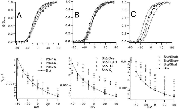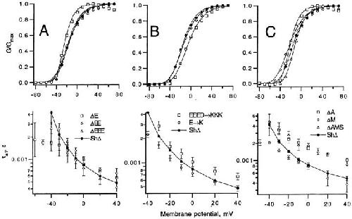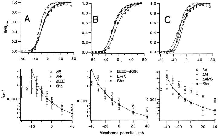 Normalized conductance-voltage (G-V) curves, and voltage dependence of activation time constant are shown for ShÎ and various mutants: (A) deletions at the