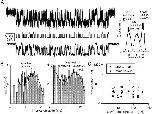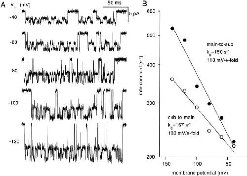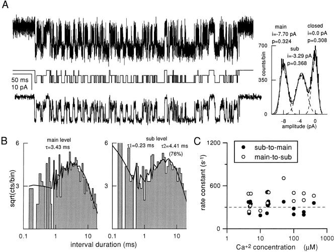 amplitude histogram of this patch (lower line is the average of the sub and main level amplitudes, weighted by the relative equilibrium occupancy of each level). The channel opens either the main or the subconductance level, indicating that gating and conductance fluctuations are not strongly coupled processes.