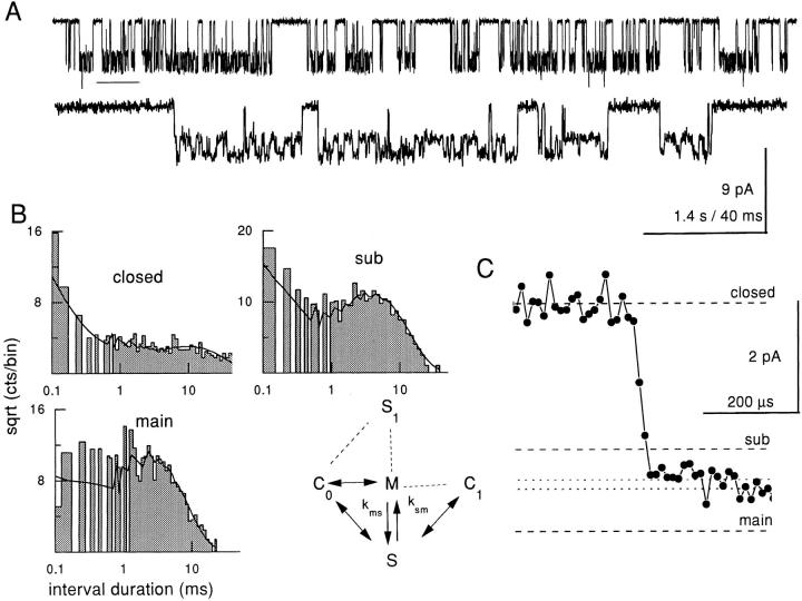 a long-lived sublevel state, S1 is a brief sublevel state, C1 is a brief closed state, C0 is a long-lived closed state; additional closed states were