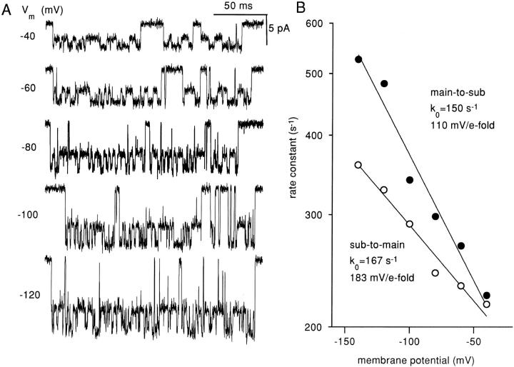 The kinetic properties of main and subconductance states of a mutant mouse N-methyl-D-aspartate (NMDA) receptor channel were examined. Recombinant receptors made of zeta-epsilon 2 (NR1-NR2B) subunits having asparagine-to-glutamine mutations in the M2 segment (zeta N598Q/epsilon 2N589Q) were expressed in Xenopus oocytes. Single channel currents recorded from outside-out patches were analyzed using hidden Markov model techniques. In Ca(2+)-free solutions, an open receptor channel occupies a main conductance (93 pS) and a subconductance (62 pS) with about equal probability. There are both brief and long-lived subconductance states, but only a single main level state. At -80 mV, the lifetime of the main and the longer-lived sub level are both approximately 3.3 ms. The gating of the pore and the transition between conductance levels are essentially independent processes. Surprisingly, hyperpolarization speeds both the sub-to-main and main-to-sub transition rate constants (approximately 120 mV/e-fold change), but does not alter the equilibrium occupancies. Extracellular Ca2+ does not influence the transition rate constants. We conclude that the subconductance levels arise from fluctuations in the energetics of ion permeation through a single pore, and that the voltage dependence of these fluctuations reflects the modulation by the membrane potential of the barrier between the main and subconductance conformations of the pore.