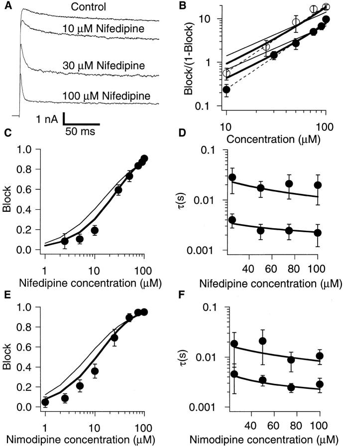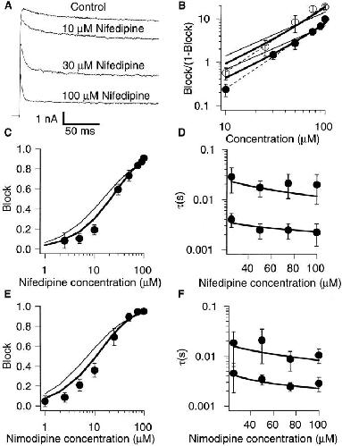 +50 mV in the presence of nifedipine at the concentrations indicated were fitted with a sum of two exponentials. (E) Relative reduction of the steady-state current by nimodipine. The data were