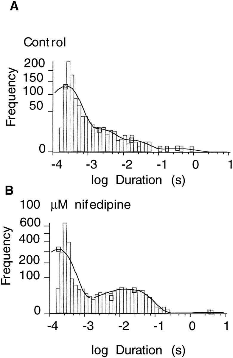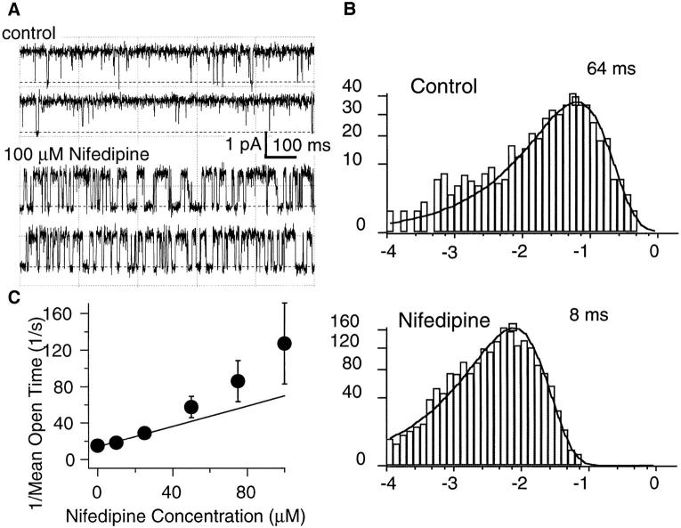 patch contained one functional channel. (B) Open time histograms with and without 100 μM nifedipine. Data are shown in
