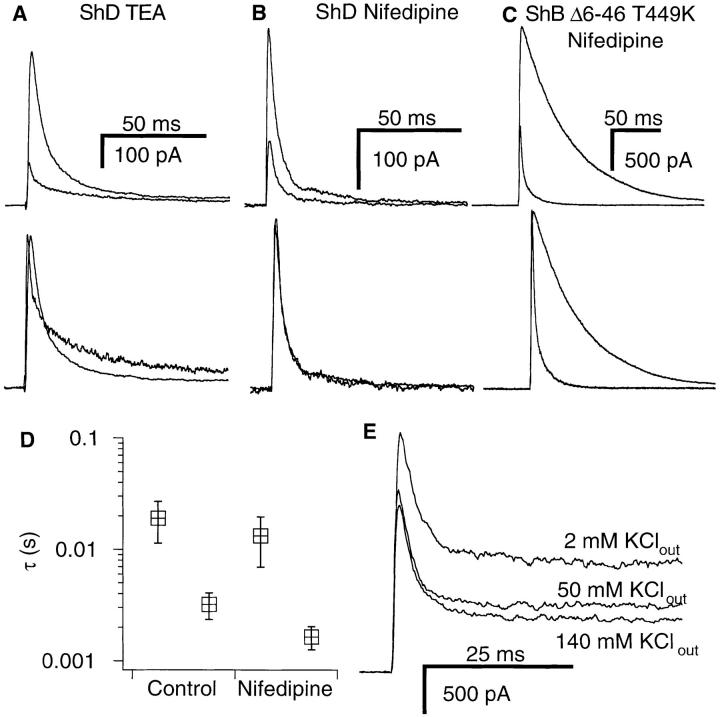 scaled currents show a cross-over. (B) Nifedipine block of the macroscopic currents through ShD channels. (C) Macroscopic currents through the ShBΔ6-46 T449K channels with C-type inactivation (control and 100 μM nifedipine). Scaled currents (lower