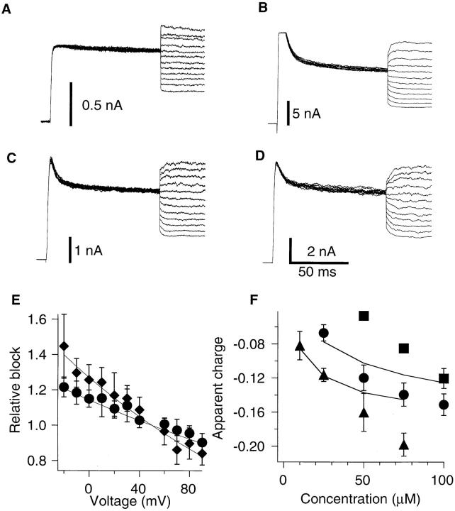 with NMG). (B) Comparison of nifedipine block (100 μM) at various voltages with high K+ (140 mM) inside (circles) and no K+ ions
