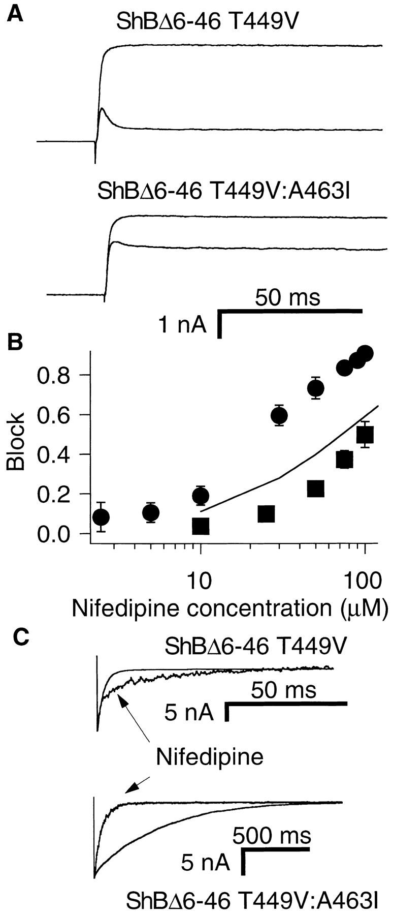 mV from ShBΔ6-46 T449V (top) and ShBΔ6-46 T449V:A463I (bottom). (B) Comparison of the concentration dependence of nifedipine block of the ShBΔ6-46 T449V (circles) and ShBΔ6-46 T449V: