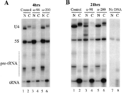 Figure 2. Differential effects of anti-xNup98 antibodies on transport of in vivo synthesized RNA polymerase II and III transcripts. A mixture of DNA templates encoding U4 snRNA, 5S rRNA, and tRNATyr was injected into oocyte nuclei together with buffer (Control) or monospecific antibodies against nucleoporins xNup98 (α-98) or xNup200 (α200). 2 h later, α[32P]GTP (∼1.0 μCi/oocyte) was injected into the cytoplasms of all oocytes. After 4 (A) or 21 h of labeling (B), oocytes (3–6/timepoint) were manually dissected, and the intracellular distributions of the newly made RNAs were determined by analyses of 0.5 oocyte equivalents of the nuclear (N) and cytoplasmic (C) RNAs in 8% denaturing polyacrylamide gels. The RNAs made from the injected genes are indicated. Endogenous oocyte RNAs made in the absence of injected genes (No DNA) are shown in B, lanes 7 and 8. The level of 5S DNA templates was ∼10-fold higher in A than in B. |