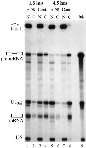 Figure 4. Inhibition of mRNA export by anti-xNup98 antibodies. Anti-xNup98 antibodies (α-98) or buffer (Cont.) was injected into oocyte nuclei and 2 h later the same oocytes received a second nuclear injection with a mixture of 32P-labeled AdML premRNA, U1Smâ RNA, and U6 RNA that had been synthesized in vitro using SP6 or T7 RNA polymerases. At 1.5 (lanes 1â4) and 4.5 h (lanes 5â8) after RNA injection, splicing of the AdML premRNA and export of the spliced mRNA and U1Smâ RNA were monitored by analyses of nuclear (N) and cytoplasmic (C) RNAs isolated from individual oocytes. The injected mixture of RNAs (Inj.) is shown in lane 9. U1Smâ RNA, which lacks a functional Sm binding site, is exported to the cytoplasm but cannot be imported back into the nucleus. U6 RNA is retained in the nucleus and serves as a marker for the accuracy of the second nuclear injection and oocyte dissections. |